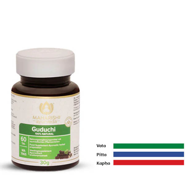 También conocida como Tinospora Cordifolia y ampliamente utilizada en Ayurveda, es una planta trepadora tropical con hojas en forma de corazón. Guduchi también se llama «Amrita» (la inmortal). Esta característica «Amrita» le permite revivir incluso después de perder todas sus hojas debido al calor extremo y la sequía, una vez que las condiciones han mejorado. Los textos ayurvédicos clásicos describen diversas propiedades positivas de esta planta especial.